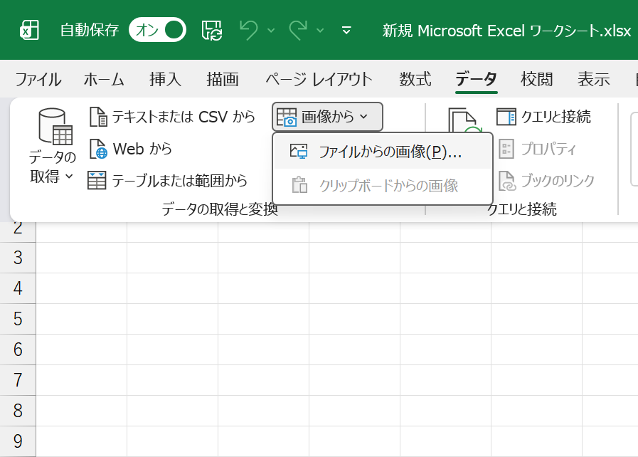 「画像からデータ」機能は、Microsoft Excelのリボンメニューにある「データ」タブから「データの取得と変換」にある「画像から」-「ファイルからの画像」および「クリップボードからの画像」を実行します。