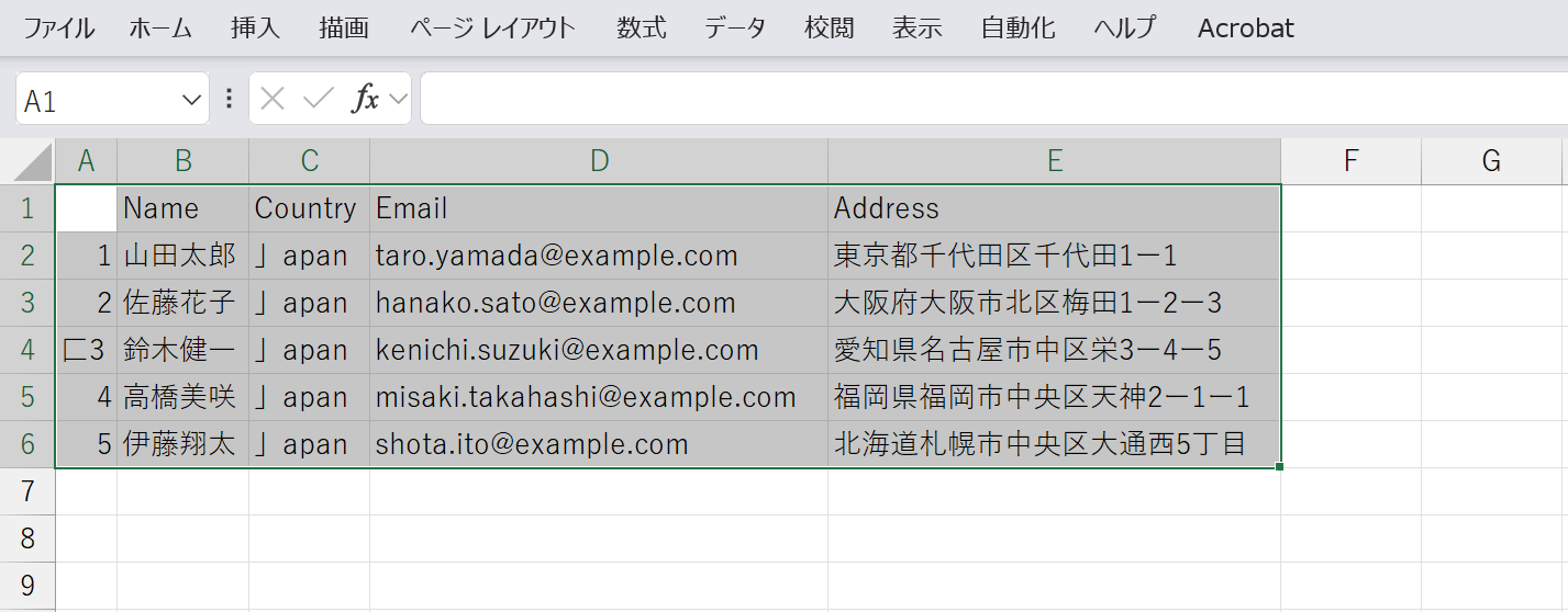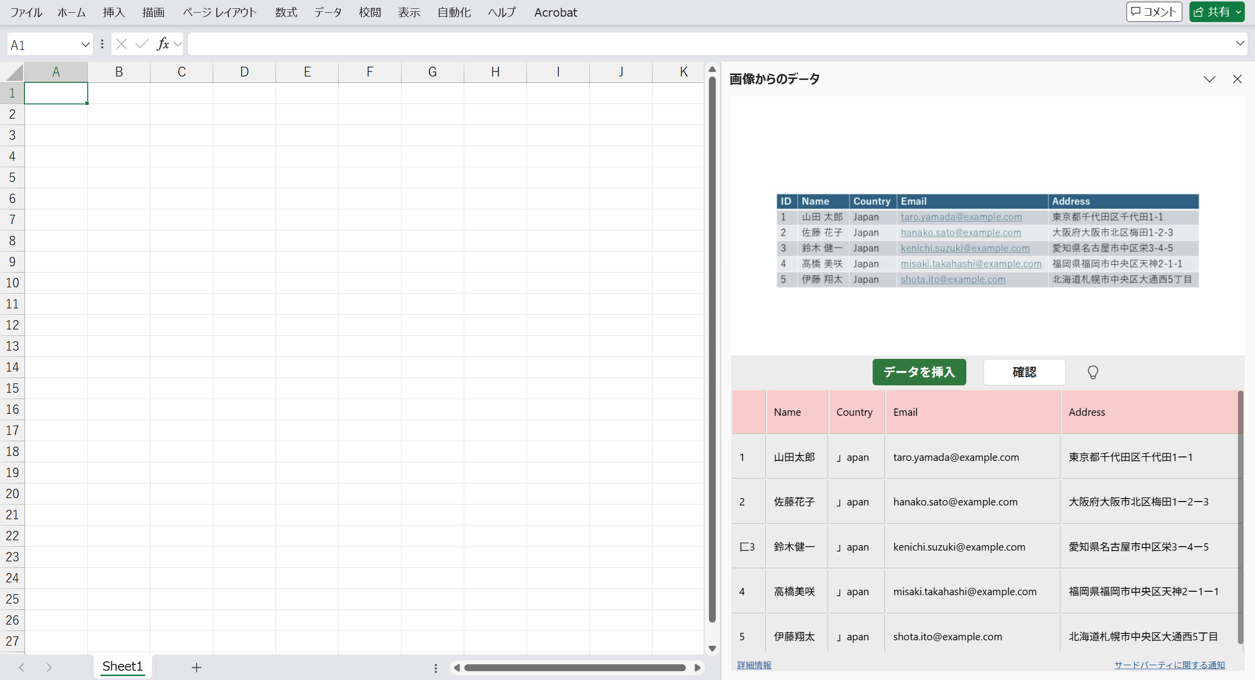 今回はそのままデータを挿入してみます。以下のように、パネルに表示された認識済みのデータがワークシートのセルに追加されます。